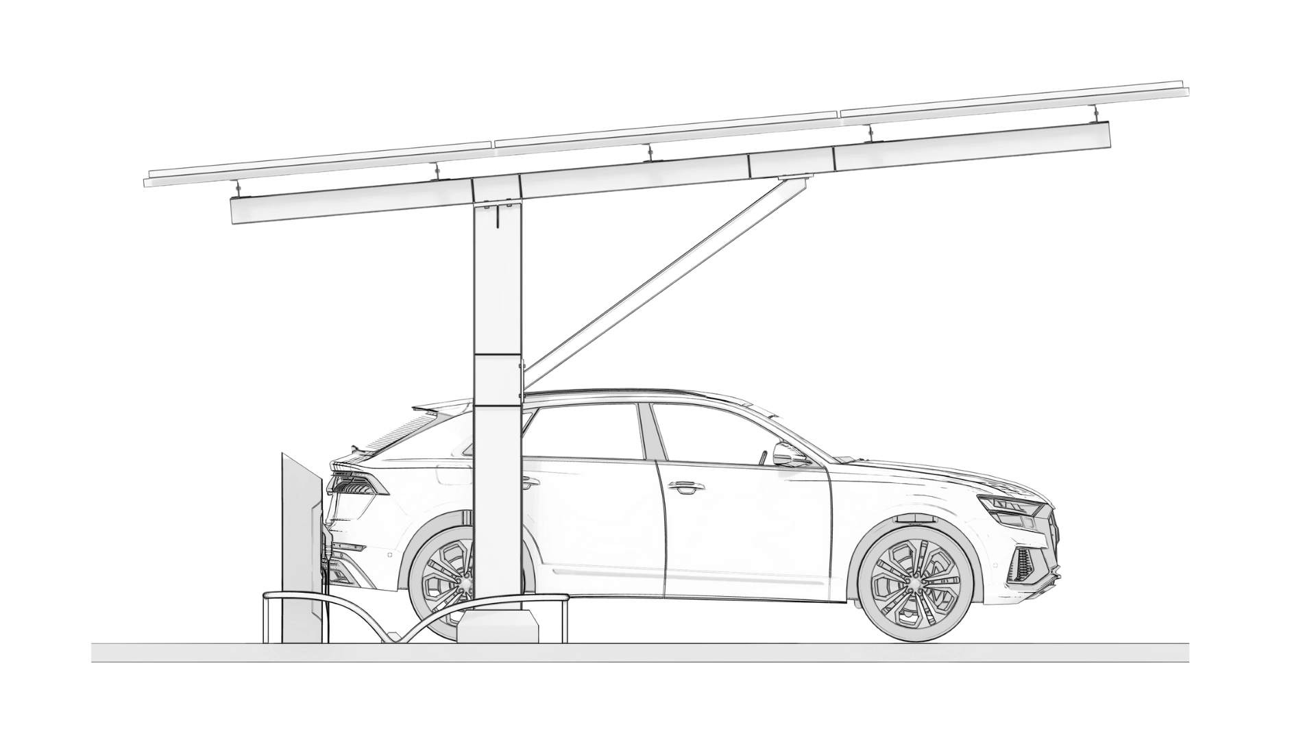 Single-row solar carport model with a vertical brace to provide durability and accessibility to the system.